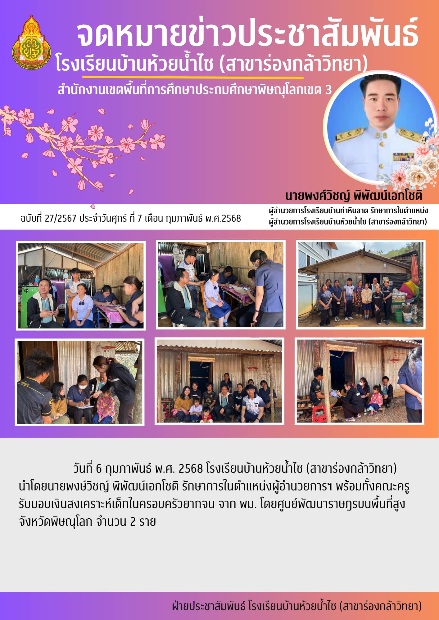 รับมอบเงินสงเคราะห์เด็กในครอบครัวยากจน จาก พม. โดยศูนย์พัฒนาราษฎรบนพื้นที่สูงจังหวัดพิษณุโลก จำนวน 2 ราย